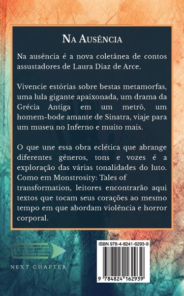 Na ausência é a nova coletânea de contos assustadores de Laura Diaz de Arce. Vivencie estórias sobre bestas metamorfas, uma lula gigante apaixonada, um drama da Grécia Antiga em um metrô, um homem-bode amante de Sinatra, viaje para um museu no Inferno e muito mais. O que une essa obra eclética que abrange diferentes gêneros, tons e vozes é a exploração das várias tonalidades do luto. Como em Monstrosity: Tales of transformation, leitores encontrarão aqui textos que tocam seus corações ao mesmo tempo em que abordam violência e horror corporal.