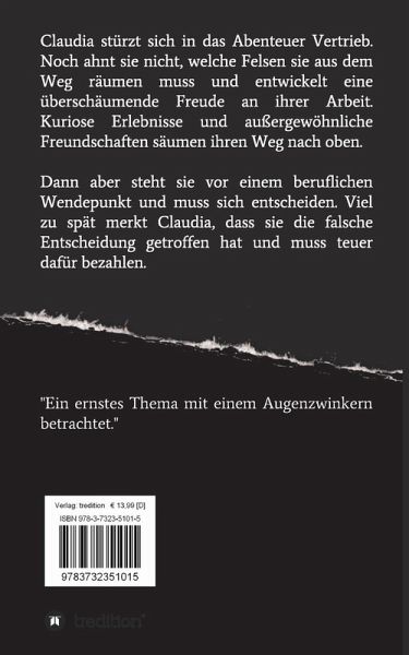 Claudia stürzt sich in das Abenteuer Vertrieb. Noch ahnt sie nicht, welche Felsen sie aus dem Weg räumen muss und entwickelt eine überschäumende Freude an ihrer Arbeit. Kuriose Erlebnisse und außergewöhnliche Freundschaften säumen ihren Weg nach oben. Dann aber steht sie vor einem beruflichen Wendepunkt und muss sich entscheiden. Viel zu spät merkt Claudia, dass sie die falsche Entscheidung getroffen hat und muss teuer dafür bezahlen.