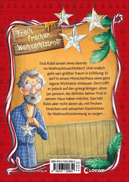 Frech, frecher, Weihnachtroll! Der Troll Rübli möchte unbedingt ein Weihnachtswichtel sein. Zu seinem Glück landet er eines Abends im Dorf der Wichtel. Die sind zwar nicht glücklich über seine Anwesenheit, aber einen Troll verärgert man lieber nicht. Also wird Rüblis Wunsch erfüllt und er darf zu den Menschen reisen. In dem ausgewählten Haus trifft er jedoch auf den griesgrämigen alten Jan Jansson, der Weihnachten genauso wenig ausstehen kann, wie Trolle es normalerweise tun. Mit ungewöhnlichen Methoden wie dem Schmücken mit honigverklebten Papiersternen oder dem Schreiben von kryptischen Nachrichten versucht Rübli, Jan in Weihnachtsstimmung zu versetzen. Dem hat ein Weihnachtstroll gerade noch gefehlt ...