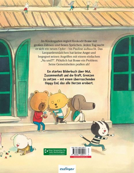 Im Kindergarten hat Krokodil Bosse das Sagen. Im Piesacken ist er der Größte. Jeden Morgen knöpft er sich ein anderes Kind vor. Und niemand wagt es, sich dagegen zu wehren ... bis das Leopardenmädchen Pauline neu an den Kindergarten kommt. Wann immer Bosse sich von nun an über andere lustig macht, hat sie nur eine Antwort parat: Na und?! Da verschlägt es Bosse glatt die Sprache, denn seine Worte haben keine Macht mehr über die anderen. Und Bosse? Schafft es endlich, zu Hause seinem fiesen großen Bruder Paroli zu bieten. Und sich bei den anderen zu entschuldigen!