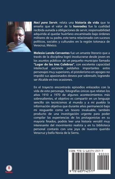 Nací para servir, relata una historia de vida que te enseña que el valor de la honradez fue la cualidad recibida aunada a obligaciones de servir, responsabilidad adquirida al quedar huérfano encaminado bajo órdenes militares de su padre, este tema relacionado con sucesos políticos, sociales y culturales en la región totonaca de Veracruz, México. Melesio Landa Cervantes fue un amante literario que a través de la disciplina logró involucrarse desde joven en los asuntos públicos de un pequeño municipio llamado "Lugar de las tres Culebras", con excelente capacidad intelectual asciende peldaños importantes entre personajes muy superiores, el pistolerismo en apogeo no impidió sus apasionados deseos por sobresalir, logrando ser Alcalde en tres ocasiones. En el trayecto encontrarás episodios enlazados con la vida de este personaje, fotografías únicas que relatan los años 1910 a 1970 de algunos acontecimientos más sobresalientes, el objetivo es compartir en un lenguaje sencillo sin tecnicismos al mundo y a mi pueblo la información objetiva que durante años permaneció bajo mi resguardo como un tesoro invaluable, también producto de una investigación urgente para poder compilar las experiencias de los protagonistas en su mayoría finados, podrás leer una historia versátil muy interesante del movimiento realista y en tu biblioteca personal contarás con una joya de nuestro querido Veracruz y bella Novia de la Sierra.