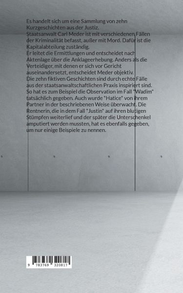 Es handelt sich um eine Sammlung von zehn Kurzgeschichten aus der Justiz. Staatsanwalt Carl Meder ist mit verschiedenen Fällen der Kriminalität befasst, außer mit Mord. Dafür ist die Kapitalabteilung zuständig. Er leitet die Ermittlungen und entscheidet nach Aktenlage über die Anklageerhebung. Anders als die Verteidiger, mit denen er sich vor Gericht auseinandersetzt, entscheidet Meder objektiv. Die zehn fiktiven Geschichten sind durch echte Fälle aus der staatsanwaltschaftlichen Praxis inspiriert sind. So hat es zum Beispiel die Observation im Fall "Wadim" tatsächlich gegeben. Auch wurde "Hatice" von ihrem Partner in der beschriebenen Weise überwacht. Die Rentnerin, die in dem Fall "Justin" auf ihren blutigen Stümpfen weiterlief und der später die Unterschenkel amputiert werden mussten, hat es ebenfalls gegeben, um nur einige Beispiele zu nennen.