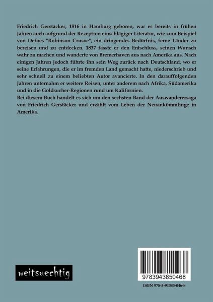 Friedrich Gerstäcker, 1816 in Hamburg geboren, war es bereits in frühen Jahren auch aufgrund der Rezeption einschlägiger Literatur, wie zum Beispiel von Defoes "Robinson Crusoe", ein dringendes Bedürfnis, ferne Länder zu bereisen und zu entdecken. 1837 fasste er den Entschluss, seinen Wunsch wahr zu machen und wanderte von Bremerhaven aus nach Amerika aus. Nach einigen Jahren jedoch führte ihn sein Weg zurück nach Deutschland, wo er seine Erfahrungen, die er im fremden Land gemacht hatte, niederschrieb und sehr schnell zu einem beliebten Autor avancierte. In den darauffolgenden Jahren unternahm er weitere Reisen, unter anderem nach Afrika, Südamerika und in die Goldsucher-Regionen rund um Kalifornien. Bei diesem Buch handelt es sich um den sechsten Band der Auswanderersaga von Friedrich Gerstäcker und erzählt vom Leben der Neuankömmlinge in Amerika.