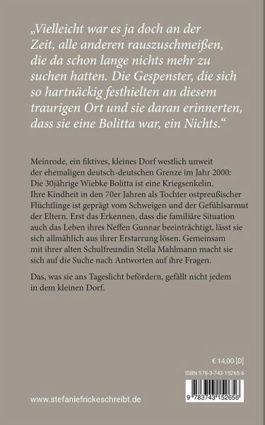 "Vielleicht war es ja doch an der Zeit, alle anderen rauszuschmeißen, die da schon lange nichts mehr zu suchen hatten. Die Gespenster, die sich so hartnäckig festhielten an diesem traurigen Ort und sie daran erinnerten, dass sie eine Bolitta war, ein Nichts."Meinrode, ein fiktives, kleines Dorf westlich unweit der ehemaligen deutsch-deutschen Grenze im Jahr 2000: Die 30jährige Wiebke Bolitta ist eine Kriegsenkelin. Ihre Kindheit in den 70er Jahren als Tochter ostpreußischer Flüchtlinge ist geprägt vom Schweigen und der Gefühlsarmut der Eltern. Erst das Erkennen, dass die familiäre Situation auch das Leben ihres Neffen Gunnar beeinträchtigt, lässt sie sich allmählich aus ihrer Erstarrung lösen. Gemeinsam mit ihrer alten Schulfreundin Stella Mahlmann macht sie sich auf die Suche nach Antworten auf ihre Fragen. Das, was sie ans Tageslicht befördern, gefällt nicht jedem in dem kleinen Dorf.