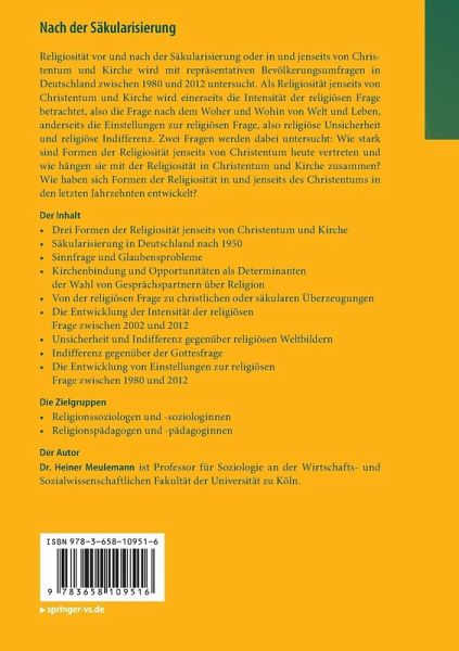Religiosität vor und nach der Säkularisierung oder in und jenseits von Christentum und Kirche wird mit repräsentativen Bevölkerungsumfragen in Deutschland zwischen 1982 und 2012 untersucht. Als Religiosität jenseits von Christentum und Kirche wird einerseits die Intensität der religiösen Frage betrachtet, also die Frage nach dem Woher und Wohin von Welt und Lebens, anderseits die Einstellungen zur religiösen Frage, also religiöse Unsicherheit und religiöse Indifferenz. Zwei Fragen werden dabei untersucht: Wie stark sind Formen der Religiosität jenseits von Christentum heute vertreten und wie hängen sie mit der Religiosität in Christentum und Kirche zusammen? Wie haben sich Formen der Religiosität in und jenseits des Christentums in den letzten Jahrzehnten entwickelt?