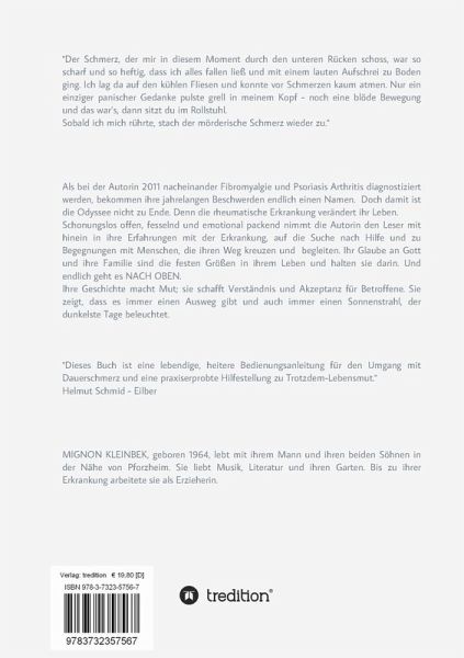 NACH OBEN ist die authentische Geschichte der Autorin.Mal witzig, mal nachdenklich, mit packender Emotionalität und auch einem Schuss Ironie schildert sie Stationen ihres Lebens und ihre Erfahrungen mit Fibromyalgie und Psoriasis Arthritis. Es ist ein langer Weg von ihren Vorerkrankungen, mit denen sie sich schon lange arrangiert hat, bis hin zur Diagnosestellung und erfolgreichen Behandlung. Sie erlebt Rückschläge und Fehldiagnosen. Die rheumatische Erkrankung schleicht sich in ihr Leben und verändert alles. Sie nimmt ihr liebgewonnene Tätigkeiten und die Schmerzen treiben sie fast in eine Depression.Ihr tiefer Glaube an Gott - ihre Familie und wegweisende Begegnungen mit Menschen zum rechten Zeitpunkt, halten sie und ermöglichen ihr neue Sichtweisen. Und endlich geht es NACH OBEN!Ihr Buch macht Mut! Es gibt Betroffenen und den Menschen, die mit ihnen zusammenleben, Hilfestellung und Information. Es schafft Akzeptanz und Verständnis für deren Situation. Es ist eine Geschichte vom Lieben und wieder geliebt werden, von echter Freundschaft und vom Glauben behalten. Sie bewegt und gibt Hoffnung. "Dieses Buch ist eine lebendige, heitere Bedienungsanleitung für den Umgang mit Dauerschmerz und eine praxiserprobte Hilfestellung zu Trotzdem-Lebensmut."Lassen Sie sich mitnehmen auf die Reise in ein "etwas anderes Leben"...