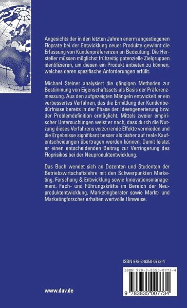 Michael Steiner analysiert die gängigen Methoden zur Bestimmung von Eigenschaftssets als Basis der Präferenzmessung. Aus den aufgezeigten Mängeln entwickelt er ein verbessertes Verfahren, das die Ermittlung der Kundenbedürfnisse bereits in der Phase der Ideengenerierung bzw. der Problemdefinition ermöglicht. Mittels zweier empirischer Untersuchungen weist er nach, dass durch die Nutzung dieses Verfahrens verzerrende Effekte vermieden und die Ergebnisse signifikant besser als bisher auf reale Kaufentscheidungen übertragen werden können. Damit leistet er einen entscheidenden Beitrag zur Verringerung des Floprisikos bei der Neuproduktentwicklung.
