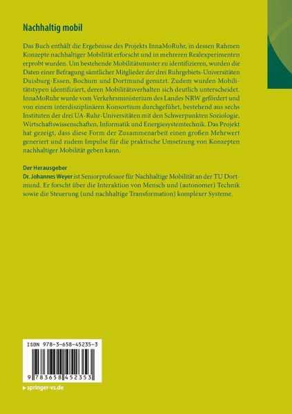Das Buch enthält die Ergebnisse des Projekts InnaMoRuhr, in dessen Rahmen Konzepte nachhaltiger Mobilität erforscht und in mehreren Realexperimenten erprobt wurden. In einem ersten Schritt wurden die Daten einer Befragung sämtlicher Mitglieder der drei Ruhrgebiets-Universitäten Duisburg-Essen, Bochum und Dortmund genutzt, um bestehende Mobilitätsmuster zu identifizieren. Zudem wurden Mobilitätstypen identifiziert, deren Mobilitätsverhalten sich deutlich unterscheidet. Sie reagieren auch unterschiedlich auf Anreize, deren Ziel es ist, sie zu einer Änderung ihres Mobilitätsverhaltens zu bewegen. Die Zukunft der Mobilität stellen sich die meisten Menschen nachhaltig, flexibel und individuell vor. Dabei spielt das Fahrrad eine wichtige Rolle. Auf Basis dieser Daten und unter Rückgriff auf Konzepte der analytischen Soziologie wurde zudem ein Modell des Mobilitätsverhaltens entwickelt, das in der Lage ist, das reale Verhalten mit großer Treffsicherheit zu erklären. Im zweiten Schritt wurden Szenario-Workshops durchgeführt, um mehrere Szenarien zukünftiger Mobilität zu entwickeln, aber auch durch Kontrastierung mit fiktiven Personas auf ihre Alltagstauglichkeit zu testen. Die erfolgversprechendsten Szenarien wurden zudem in Simulationsexperimenten evaluiert und schließlich in drei Realexperimenten mit freiwilligen Probanden erprobt (Schritt 3). Dabei kam eine selbst entwickelte Mobilitäts-App zum Einsatz, die nicht nur Routing-Empfehlungen gab, sondern auch ein - anonymes - Tracking der Versuchsteilnehmer ermöglichte, ergänzt um Feedback-Funktionen, die reichlich genutzt wurden. Das Projekt InnaMoRuhr wurde vom Verkehrsministerium des Landes NRW gefördert und von einem interdisziplinären Konsortium durchgeführt, bestehend aus sechs Instituten der drei UA-Ruhr-Universitäten mit den Schwerpunkten Soziologie, Wirtschaftswissenschaften, Informatik und Energiesystemtechnik. Das Projekt hat gezeigt, dass diese Form der Zusammenarbeit einen großen Mehrwert generiert und zudem Impulse für die praktische Umsetzung von Konzepten nachhaltiger Mobilität geben kann.