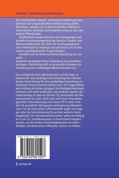 Das vorliegende Buch gibt Antworten auf die Frage, inwieweit die verursachergerechte Anlastung der externen Kosten einen Beitrag für eine nachhaltige Entwicklung im deutschen Personenverkehr leisten kann. Die Fragestellung wird entlang der beiden gängigen Nachhaltigkeitskonzepte (schwach und stark) untersucht. Das zentrale Ergebnis der Untersuchung ist, dass im Fall der CO 2 -Emissionen der Personenverkehr im Jahre 2020 auch nach einer verursachergerechten Internalisierung noch immer 90 % mehr emittiert als gemäß der ökologischen Anforderung tolerierbar wäre. Für die klassischen Luftschadstoffe ergibt sich dagegen über die Internalisierung hinaus kein weiterer Handlungsbedarf. Der Personenverkehrssektor sollte von Anfang an in ein CO 2 -Zertifikatesystem in Deutschland integriert werden, um die starken Nachhaltigkeitsziele mit einem flexiblen und ökonomisch effizienten System zu erfüllen.