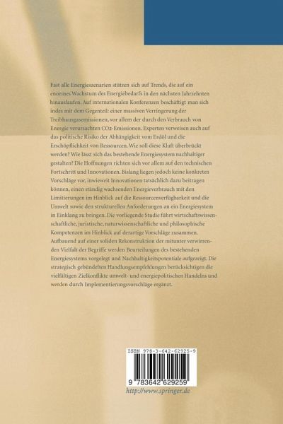 Fast alle Energieszenarien stützen sich auf Trends, die auf ein enormes Wachstum des Energiebedarfs in den nächsten Jahrzehnten hinauslaufen. Auf internationalen Konferenzen beschäftigt man sich indes mit dem Gegenteil: einer massiven Verringerung der Treibhausgasemissionen, vor allem der durch den Verbrauch von Energie verursachten CO2-Emissionen. Experten verweisen auch auf das politische Risiko der Abhängigkeit vom Erdöl und die Erschöpflichkeit von Ressourcen. Wie soll diese Kluft überbrückt werden? Wie lässt sich das bestehende Energiesystem nachhaltiger gestalten? Die Hoffnungen richten sich vor allem auf den technischen Fortschritt und Innovationen. Bislang liegen jedoch keine konkreten Vorschläge vor, inwieweit Innovationen tatsächlich dazu beitragen können, einen ständig wachsenden Energieverbrauch mit den Limitierungen im Hinblick auf die Ressourcenverfügbarkeit und die Umwelt sowie den strukturellen Anforderungen an ein Energiesystem in Einklang zu bringen. Die vorliegende Studie führt wirtschaftswissenschaftliche, juristische, naturwissenschaftliche und philosophische Kompetenzen im Hinblick auf derartige Vorschläge zusammen. Aufbauend auf einer soliden Rekonstruktion der mitunter verwirrenden Vielfalt der Begriffe werden Beurteilungen des bestehenden Energiesystems vorgelegt und Nachhaltigkeitspotenziale aufgezeigt. Die strategisch gebündelten Handlungsempfehlungen berücksichtigen die vielfältigen Zielkonflikte umwelt- und energiepolitischen Handelns und werden durch Implementierungsvorschläge ergänzt.