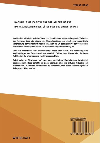 Nachhaltigkeit ist ein globaler Trend und findet immer größeren Zuspruch. Viele sind der Meinung, dass die Lösung der Umweltprobleme nur durch eine wesentliche Veränderung der Wirtschaft möglich ist. Auch die UN setzt sich mit der Vorgabe der Sustainable Development Goals für eine nachhaltige Entwicklung ein.Doch die Finanzwirtschaft berücksichtigt diese Ziele kaum. Wie nachhaltig sind Kapitalanlagen am Finanzmarkt also wirklich? Tobias Haas thematisiert in dieser Publikation die Intransparenz von Finanzprodukten.Dabei zeigt er Strategien auf, wie eine nachhaltige Kapitalanlage tatsächlich gelingen kann. Haas schafft so einen Überblick über die aktuelle Situation am Finanzmarkt. Außerdem verdeutlicht er, inwieweit jetzt schon Nachhaltigkeit in Anlageprodukten besteht.Aus dem Inhalt:-Nachhaltigkeit;-Umweltverschmutzung;-Finanzwirtschaft;-Kapitalanlage;-Vermögensanlage;-Umweltbank