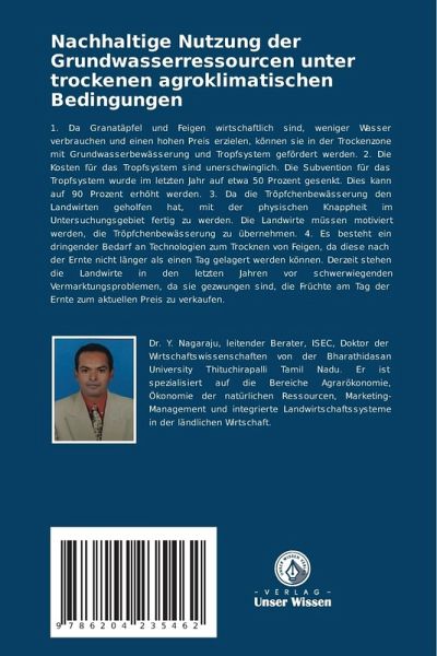 1. Da Granatäpfel und Feigen wirtschaftlich sind, weniger Wasser verbrauchen und einen hohen Preis erzielen, können sie in der Trockenzone mit Grundwasserbewässerung und Tropfsystem gefördert werden. 2. Die Kosten für das Tropfsystem sind unerschwinglich. Die Subvention für das Tropfsystem wurde im letzten Jahr auf etwa 50 Prozent gesenkt. Dies kann auf 90 Prozent erhöht werden. 3. Da die Tröpfchenbewässerung den Landwirten geholfen hat, mit der physischen Knappheit im Untersuchungsgebiet fertig zu werden. Die Landwirte müssen motiviert werden, die Tröpfchenbewässerung zu übernehmen. 4. Es besteht ein dringender Bedarf an Technologien zum Trocknen von Feigen, da diese nach der Ernte nicht länger als einen Tag gelagert werden können. Derzeit stehen die Landwirte in den letzten Jahren vor schwerwiegenden Vermarktungsproblemen, da sie gezwungen sind, die Früchte am Tag der Ernte zum aktuellen Preis zu verkaufen.