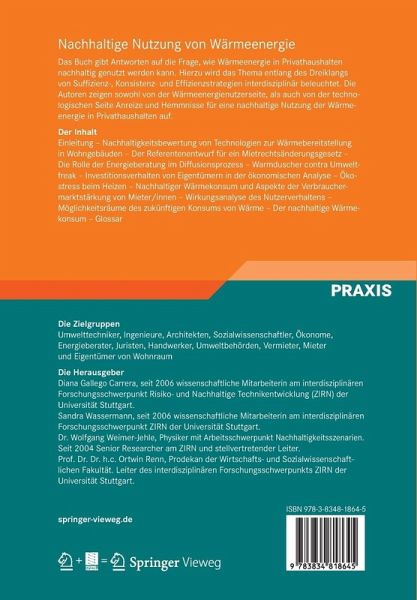 Das Buch gibt Antworten auf die Frage, wie Wärmeenergie in Privathaushalten nachhaltig genutzt werden kann. Hierzu wird das Thema entlang des Dreiklangs von Suffizienz-, Konsistenz- und Effizienzstrategien interdisziplinär beleuchtet.Die Autoren zeigen sowohl von der Wärmeenergienutzerseite, als auch von der technologischen Seite Anreize und Hemmnisse für eine nachhaltige Nutzung der Wärmeenergie in Privathaushalten auf.Die umfassende und interdisziplinäre Darstellung des Themas bietet sowohl Nutzern als auch Fachleuten einen umfassenden Einblick in das Themenfeld der Wärmeenergienutzung in Privathaushalten.