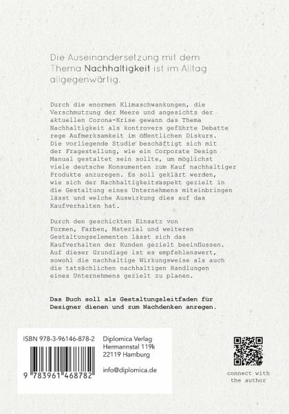 Die Auseinandersetzung mit dem Thema Nachhaltigkeit ist im Alltag allgegenwärtig. Durch die enormen Klimaschwankungen, die Verschmutzung der Meere und angesichts der aktuellen Corona-Krise gewann das Thema Nachhaltigkeit als kontrovers geführte Debatte rege Aufmerksamkeit im öffentlichen Diskurs. Die vorliegende Studie beschäftigt sich mit der Fragestellung, wie ein Corporate Design Manual gestaltet sein sollte, um möglichst viele deutsche Konsumenten zum Kauf nachhaltiger Produkte anzuregen. Es soll geklärt werden, wie sich der Nachhaltigkeitsaspekt gezielt in die Gestaltung eines Unternehmens miteinbringen lässt und welche Auswirkung dies auf das Kaufverhalten hat. Durch den geschickten Einsatz von Formen, Farben, Material und weiteren Gestaltungselementen lässt sich das Kaufverhalten der Kunden gezielt beeinflussen. Auf dieser Grundlage ist es empfehlenswert, sowohl die nachhaltige Wirkungsweise als auch die tatsächlichen nachhaltigen Handlungen eines Unternehmens gezielt zu planen.Das Buch soll als Gestaltungsleitfaden für Designer dienen und zum Nachdenken anregen.