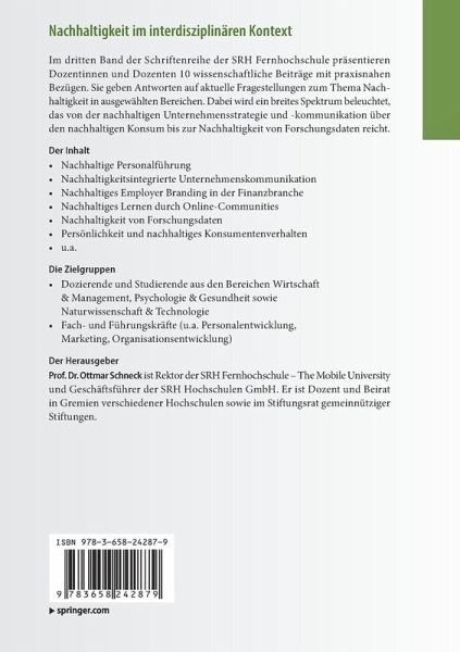 Im dritten Band der Schriftenreihe der SRH Fernhochschule präsentieren Dozentinnen und Dozenten 10 wissenschaftliche Beiträge mit praxisnahen Bezügen. Sie geben Antworten auf aktuelle Fragestellungen zum Thema Nachhaltigkeit in ausgewählten Bereichen. Dabei wird ein breites Spektrum beleuchtet, das von der nachhaltigen Unternehmensstrategie und -kommunikation über den nachhaltigen Konsum bis zur Nachhaltigkeit von Forschungsdaten reicht.
