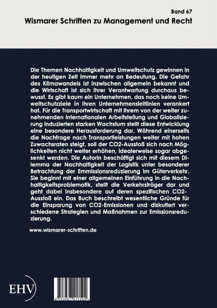 Die Themen Nachhaltigkeit und Umweltschutz gewinnen in der heutigen Zeit immer mehr an Bedeutung. Die Gefahr des Klimawandels ist inzwischen allgemein bekannt und die Wirtschaft ist sich ihrer Verantwortung durchaus bewusst. Es gibt kaum ein Unternehmen, das noch keine Umweltschutzziele in ihren Unternehmensleitlinien verankert hat. Für die Transportwirtschaft mit ihrem von der weiter zunehmenden internationalen Arbeitsteilung und Globalisierung induzierten starken Wachstum stellt diese Entwicklung eine besondere Herausforderung dar. Während einerseits die Nachfrage nach Transportleistungen weiter mit hohen Zuwachsraten steigt, soll der CO2-Ausstoß sich nach Möglichkeiten nicht weiter erhöhen, idealerweise sogar abgesenkt werden. Die Autorin beschäftigt sich mit diesem Dilemma der Nachhaltigkeit der Logistik unter besonderer Betrachtung der Emmissionsreduzierung im Güterverkehr. Sie beginnt mit einer allgemeinen Einführung in die Nachhaltigkeitsproblematik, stellt die Verkehrsträger dar und geht dabei insbesondere auf deren spezifischen CO2-Ausstoß ein. Das Buch beschreibt wesentliche Gründe für die Einsparung von CO2-Emissionen und diskutiert verschiedene Strategien und Maßnahmen zur Emissionsreduzierung.