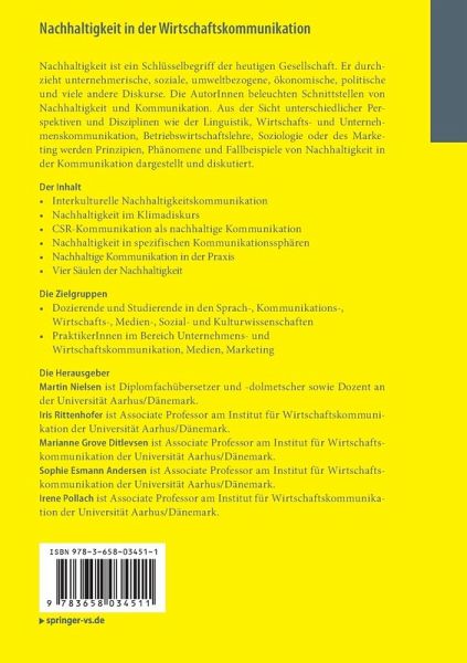 Interkulturelle achhaltigkeitskommunikation.- Nachhaltigkeit im Klimadiskurs.- CSR-Kommunikation als nachhaltige Kommunikation.- Nachhaltigkeit in spezifischen Kommunikationssphären.- Nachhaltige Kommunikation in der Praxis - vier Säulen der Nachhaltigkeit.