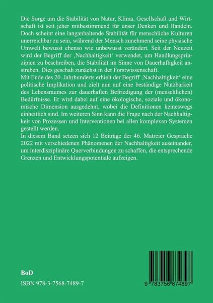 Die Sorge um die Stabilität von Natur, Klima, Gesellschaft und Wirtschaft ist seit jeher mitbestimmend für unser Denken und Handeln. Doch scheint eine langanhaltende Stabilität für menschliche Kulturen unerreichbar zu sein, während der Mensch zunehmend seine physische Umwelt bewusst ebenso wie unbewusst verändert. Seit der Neuzeit wird der Begriff der "Nachhaltigkeit" verwendet, um Handlungsprinzipien zu beschreiben, die Stabilität im Sinne von Dauerhaftigkeit anstreben. Dies geschah zunächst in der Forstwissenschaft.Mit Ende des 20. Jahrhunderts erhielt der Begriff "Nachhaltigkeit" eine politische Implikation und zielt nun auf eine beständige Nutzbarkeit des Lebensraumes zur dauerhaften Befriedigung der (menschlichen) Bedürfnisse. Er wird dabei auf eine ökologische, soziale und ökonomische Dimension ausgedehnt, wobei die Definitionen keineswegs einheitlich sind. Im weiteren Sinn kann die Frage nach der Nachhaltigkeit von Prozessen und Interventionen bei allen komplexen Systemen gestellt werden. In diesem Band setzen sich 12 Beiträge der 46. Matreier Gespräche 2022 mit verschiedenen Phänomenen der Nachhaltigkeit auseinander, um interdisziplinäre Querverbindungen zu schaffen, die entsprechende Grenzen und Entwicklungspotentiale aufzeigen.