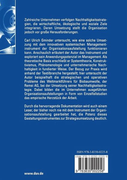 Carl Ulrich Gminder untersucht, wie eine solche Umsetzung mit dem innovativen systemischen Managementinstrument der Organisationsaufstellung funktionieren kann. Anschaulich erläutert der Autor das Instrument und exploriert sein Anwendungspotenzial im Management. Als theoretische Basis erschließt er Systemtheorie, Konstruktivismus, Phänomenologie und unternehmerische Nachhaltigkeit in fundierter Weise. Der Bezug zur Praxis wird anhand der Textilbranche hergestellt; hier untersucht der Autor beispielhaft die strategischen und operativen Probleme des Weltmarktführers für Biobaumwolle, der Remei AG, bei der Umsetzung seiner Nachhaltigkeitsstrategie. Dabei bilden die im Unternehmen ausgeführten Organisationsaufstellungen in Form von Einzelfallstudien das empirische Herzstück der Arbeit.