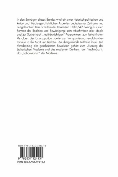 In den Beiträgen dieses Bandes wird ein unter historisch-politischen und kultur- und literaturgeschichtlichen Aspekten bedeutsamer Zeitraum neu ausgeleuchtet. Das Scheitern der Revolution 1848/49 zwang zu vielen Formen der Reaktion und Bewältigung: zum Abschwören alter Ideale und zur Suche nach "realitätstüchtigen" Programmen, zum beharrlichen Verfolgen der Emanzipation sowie zur Transponierung revolutionärer Impulse in die Kunst und Literatur. Die übergreifende Leitthese lautet: Die Verarbeitung der gescheiterten Revolution gehört zum Ursprung der ästhetischen Moderne und des modernen Denkens, der Nachmärz ist das "Laboratorium" der Moderne.