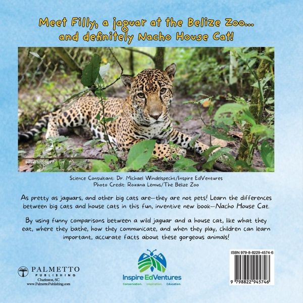 Big cats are cute, look cuddly, and seem like they'd be a fun pet to have because they're so big! But they're nacho average house cats. Meet a Belize jaguar and find out why! As pretty as jaguars and other big cats are-they are not pets! Learn the differences between big cats and house cats in a fun, inventive new book called Nacho House Cat. By using funny comparisons between a wild jaguar and a house cat, like...What they eat. Where they bathe. How they communicate. When they play. ...children can learn important, accurate facts about these gorgeous animals! Nacho House Cat started as an educational idea. Ashley's goal with her new release is for kids to both learn the science facts about jaguars through the rhyming text and laughing hysterically at silly images that back up the idea that jaguars are... nacho house cat! To accomplish this, she teamed with Dr. Michael Windelspecht, a biologist at Inspire EdVentures who works with jaguar education projects in Belize. This early reader book features vibrant illustrations and an easy-to-understand narrative. It's intended for children ages two and up to around eight years old. However, any-aged child with a love for reading, animals, and the world around them will find it enjoyable. Fans of Dr. Seuss and Karen Beaumont will resonate with the rhyme scene, the illustrations, and the silly-but-educational structure of Nacho House Cat.