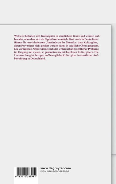 Weltweit befinden sich Kulturgüter in staatlichem Besitz und werden aufbewahrt, ohne dass sich ein Eigentümer ermitteln lässt. Auch in Deutschland führen die verschiedensten Umstände zu der Situation, dass Kulturgüter, deren Provenienz nicht geklärt werden kann, in staatliche Obhut gelangen. Die vorliegende Arbeit widmet sich der Untersuchung rechtlicher Probleme im Umgang mit diesen, so genannten nachrichtenlosen Kulturgütern. Die Untersuchung ist bezogen auf bewegliche Kulturgüter in staatlicher Aufbewahrung in Deutschland.