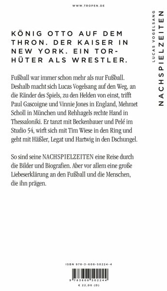Fußball war immer schon mehr als nur Fußball. Deshalb macht sich Lucas Vogelsang auf den Weg, an die Ränder des Spiels, zu den Helden von einst, trifft Paul Gascoigne und Vinnie Jones in England, Mehmet Scholl in München und Rehhagels rechte Hand in Thessaloniki. Er tanzt mit Beckenbauer und Pelé im Studio 54, wirft sich mit Tim Wiese in den Ring und geht mit Häßler, Legat und Hartwig in den Dschungel.