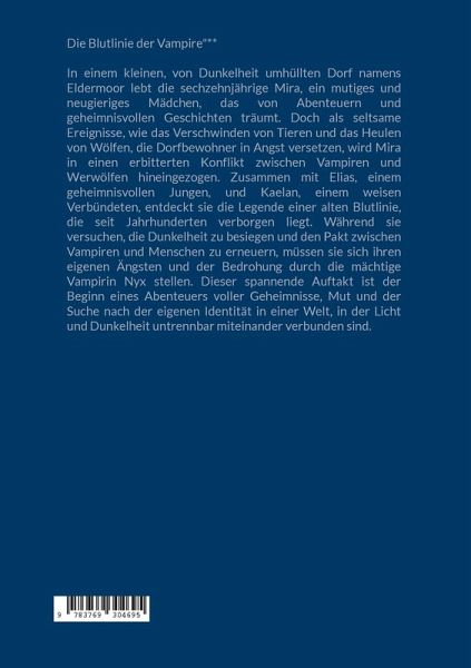 Die Blutlinie der Vampire"** In einem kleinen, von Dunkelheit umhüllten Dorf namens Eldermoor lebt die sechzehnjährige Mira, ein mutiges und neugieriges Mädchen, das von Abenteuern und geheimnisvollen Geschichten träumt. Doch als seltsame Ereignisse, wie das Verschwinden von Tieren und das Heulen von Wölfen, die Dorfbewohner in Angst versetzen, wird Mira in einen erbitterten Konflikt zwischen Vampiren und Werwölfen hineingezogen. Zusammen mit Elias, einem geheimnisvollen Jungen, und Kaelan, einem weisen Verbündeten, entdeckt sie die Legende einer alten Blutlinie, die seit Jahrhunderten verborgen liegt. Während sie versuchen, die Dunkelheit zu besiegen und den Pakt zwischen Vampiren und Menschen zu erneuern, müssen sie sich ihren eigenen Ängsten und der Bedrohung durch die mächtige Vampirin Nyx stellen. Dieser spannende Auftakt ist der Beginn eines Abenteuers voller Geheimnisse, Mut und der Suche nach der eigenen Identität in einer Welt, in der Licht und Dunkelheit untrennbar miteinander verbunden sind.