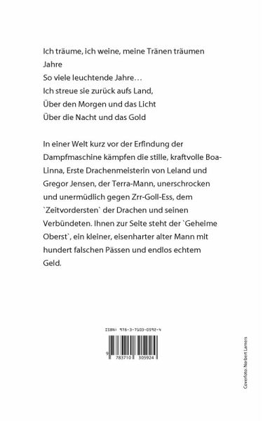 Boa-Linna, Erste Drachenmeisterin von Leland und Gregor Jensen, der Terra-Mann, kämpfen unermüdlich gegen Zrr-Goll-Ess, dem `Zeitvordersten` der Drachen. Ihnen zur Seite steht der `Geheime Oberst`, ein kleiner, harter alter Mann mit hundert falschen Pässen.