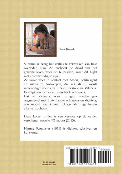Suzanne is bezig het verlies te verwerken van haar overleden man. Ze probeert de draad van het gewone leven weer op te pakken, maar dit blijkt niet zo eenvoudig te zijn. Ze komt weer in contact met Albert, politieagent en auteur te Antwerpen, die net als zij wordt uitgenodigd voor een literatuurfestival in Valencia. Er volgt een romance tussen beide schrijvers. Dat in Valencia, waar lezingen worden georganiseerd met buitenlandse schrijvers en dichters, een moord zou kunnen plaatsvinden ligt buiten elke verwachting. Deze korte thriller is een vervolg op de eerder verschenen novelle Waterroos (2015).…mehr