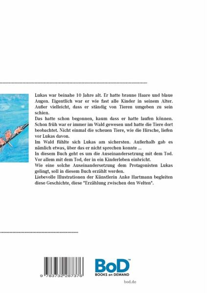 Lukas war beinahe 10 Jahre alt. Er hatte braune Haare und blaue Augen. Eigentlich war er wie fast alle Kinder in seinem Alter. Außer vielleicht, dass er ständig von Tieren umgeben zu sein schien. Das hatte schon begonnen, kaum dass er hatte laufen können. Schon früh war er immer im Wald gewesen und hatte die Tiere dort beobachtet. Nicht einmal die scheuen Tiere, wie die Hirsche, liefen vor Lukas davon.Im Wald fühlte sich Lukas am sichersten. Außerhalb gab es nämlich etwas, über das er nicht sprechen konnte ...In diesem Buch geht es um die Auseinandersetzung mit dem Tod. Vor allem mit dem Tod, der in ein Kinderleben einbricht. Wie eine solche Auseinandersetzung dem Protagonisten Lukas gelingt, soll in diesem Buch erzählt werden.Liebevolle Illustrationen der Künstlerin Anke Hartmann begleiten diese Geschichte.