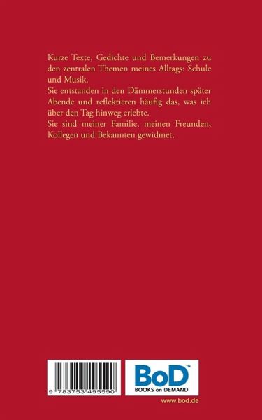 Kurze Texte, Gedichte und Bemerkungen zu den zentralen Themen meines Alltags: Schule und Musik.Sie entstanden in den Dämmerstunden später Abende und reflektieren häufig das, was ich über den Tag hinweg erlebte.Sie sind meiner Familie, meinen Freunden, Kollegen und Bekannten gewidmet.