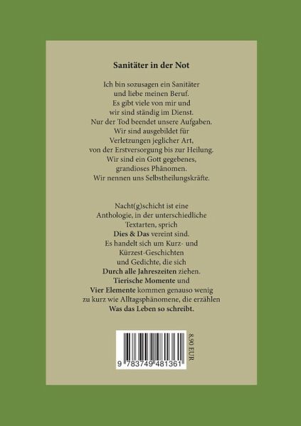 Sanitäter in der NotIch bin sozusagen ein Sanitäter und liebe meinen Beruf.Es gibt viele von mir und wir sind ständig im Dienst.Nur der Tod beendet unsere Aufgaben.Wir sind ausgebildet für Verletzungen jeglicher Art.,von der Erstversorgung bis zur Heilung.Wir sind ein Gott gegebenes, grandioses Phänomen.Wir nennen uns Selbstheilungskräfte.Nacht(g)schicht ist eine Anthologie, in der unterschiedliche Textarten, sprich Dies & Das vereint sind. Es handelt sich um Kurz- und Kürzest-Geschichten und Gedichte, die sich durch alle Jahreszeiten ziehen.Tierische Momente und vier Elemente kommen genauso wenig zu kurz wie Alltagsphänomene, die erzählen was das Leben so schreibt.