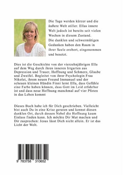 Ella grübelt. Und Ella ist traurig. Die Tage werden kürzer und die äußere Welt stiller. Ellas innere Welt jedoch ist bereits seit vielen Wochen in diesem Zustand. Die dunklen und schwermütigen Gedanken haben den Raum in ihrer Seele erobert, eingenommen und besetzt.Dies ist die Geschichte von der vierzehnjährigen Ella auf dem Weg durch ihren inneren Irrgarten aus Depression und Trauer, Hoffnung und Schmerz, Glaube und Zweifel. Begleitet von ihrer Psychologin Frau Nikolei, ihrem neuen Freund Immanuel und der scheuen kleinen Hündin Finni lernt Ella, dass Gefühle eine Farbe haben können, dass Gott im Leid erfahrbar ist und dass neue Hoffnung manchmal auf vier Pfoten in das Leben kommt.