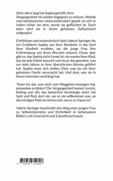 Zehn Jahre lang hat Sophia gehofft, ihrer Vergangenheit nie wieder begegnen zu müssen. Weitab vom kleinkarierten Unterwollerndorf glaubt sie sich in Indien sicher vor dem, wovor sie geflüchtet ist. Doch dann wird sie in ihrem geheimen Zufluchtsort aufgespürt. Einfühlsam und melancholisch lässt Valerie Springer die Ich-Erzählerin Sophia von ihrer Rückkehr in das Dorf ihrer Kindheit erzählen, wo die junge Frau ihre Entfremdung von ihren Wurzeln erkennt. Etwas aber gibt es, das Sophia nicht fremd ist: ein mysteriöses Kind, das sie jede Nacht besucht und sie an das gemahnt, was vor zehn Jahren zu ihrer überstürzten Abreise geführt hat. Sophia muss sich stellen. Dem, was sie mit ihrer geheimen Flucht verursacht hat. Und dem, was sie in ihrem Innersten verdrängt hat. "Kann ich das, was mich zum Weggehen bewogen hat, jemandem erzählen? Die Vergangenheit kommt zurück, klebrig und zäh, das beharrlich Verdrängte kehrt mit Sack und Pack dort ein, wo es nie willkommen war, an den einzigen Platz im Universum, wo es zu Hause ist." Valerie Springer beschreibt den Weg einer jungen Frau zu Selbsterkenntnis und Ehrlichkeit in behutsamen Bildern, mit Zuversicht und Zukunftsvertrauen.