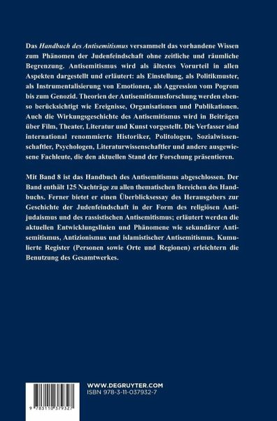 Mit dem Erscheinen des achten Bandes ist das Handbuch des Antisemitismus abgeschlossen. Damit existiert erstmals ein enzyklopädisches Kompendium zu sämtlichen Aspekten der Judenfeindschaft ohne zeitliche oder räumliche Grenzen von der Antike bis zur Gegenwart in allen relevanten Nationen und Regionen. Thematisiert wird die ganze Bandbreite antijüdischer Phänomene: Christlicher Antijudaismus, rassistischer moderner Antisemitismus, sekundärer Antisemitismus, Antizionismus, Ressentiments islamischer Gesellschaften. Personen, Ereignisse, Publikationen und kulturelle Manifeste der Judenfeindschaft sind in einzelnen Bänden Gegenstand ausführlicher Behandlung durch ausgewiesene Experten. Der abschließende achte Band bietet neben aktuellen Nachträgen zu allen Bereichen des Gesamtwerks ausführliche Register und Verweise. Darüber hinaus enthält er einen Überblicksessay des Herausgebers zu den Entwicklungslinien und Phänomenen der Judenfeindschaft, vom Antijudaismus zum Antizionismus.