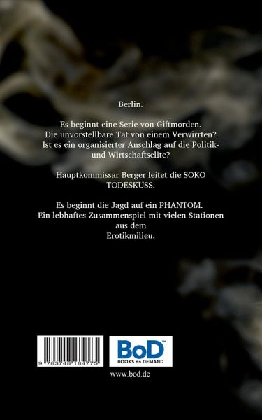 Berlin. Es beginnt eine Serie von Giftmorden. Die unvorstellbare Tat von einem Verwirrten?Ist es ein organisierter Anschlag auf die Politik und Wirtschaftselite? Hauptkommissar Berger leitet die SOKO TODESKUSS. Es beginnt die Jagd auf ein PHANTOM. Ein lebhaftes Zusammenspiel mit vielen Stationen aus dem Erotikmilieu.