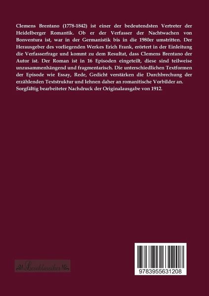 Clemens Brentano (1778-1842) ist einer der bedeutendsten Vertreter der Heidelberger Romantik. Ob er der Verfasser der Nachtwachen von Bonventura ist, war in der Germanistik bis in die 1980er umstritten. Der Herausgeber des vorliegenden Werkes Erich Frank, erörtert in der Einleitung die Verfasserfrage und kommt zu dem Resultat, dass Clemens Brentano der Autor ist. Der Roman ist in 16 Episoden eingeteilt, diese sind teilweise unzusammenhängend und fragmentarisch. Die unterschiedlichen Textformen der Episode wie Essay, Rede, Gedicht verstärken die Durchbrechung der erzählenden Textstruktur und lehnen daher an romanitische Vorbilder an.
