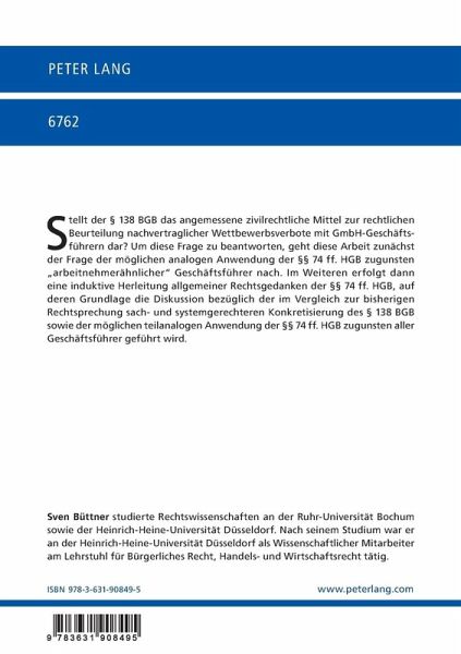 Stellt der § 138 BGB das angemessene zivilrechtliche Mittel zur rechtlichen Beurteilung nachvertraglicher Wettbewerbsverbote mit GmbH-Geschäftsführern dar? Um diese Frage zu beantworten, geht diese Arbeit zunächst der Frage der möglichen analogen Anwendung der §§ 74 ff. HGB zugunsten "arbeitnehmerähnlicher" Geschäftsführer nach. Im Weiteren erfolgt dann eine induktive Herleitung allgemeiner Rechtsgedanken der §§ 74 ff. HGB, auf deren Grundlage die Diskussion bezüglich der im Vergleich zur bisherigen Rechtsprechung sach- und systemgerechteren Konkretisierung des § 138 BGB sowie der möglichen teilanalogen Anwendung der §§ 74 ff. HGB zugunsten aller Geschäftsführer geführt wird.