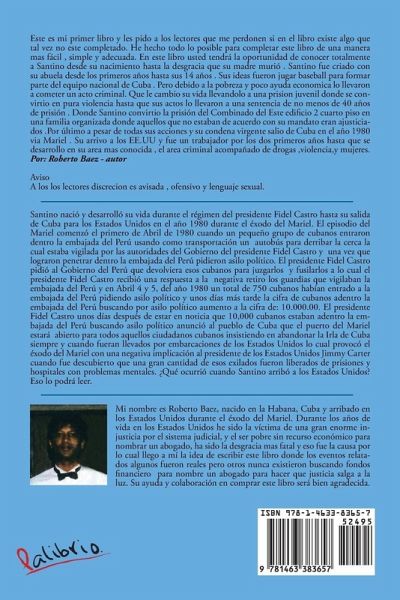 Este es mi primer libro y les pido a los lectores que me perdonen si en el libro existe algo que tal vez no este completado. He hecho todo lo posible para completar este libro de una manera mas fácil , simple y adecuada. En este libro usted tendrá la oportunidad de conocer totalmente a Santino desde su nacimiento hasta la desgracia que su madre murió . Santino fue criado con su abuela desde los primeros años hasta sus 14 años . Sus ideas fueron jugar baseball para formar parte del equipo nacional de Cuba . Pero debido a la pobreza y poco ayuda economica lo llevaron a cometer un acto criminal. Que le cambio su vida llevandolo a una prision juvenil donde se convirtio en pura violencia hasta que sus actos lo llevaron a una sentencia de no menos de 40 años de prisión . Donde Santino convirtio la prisión del Combinado del Este edificio 2 cuarto piso en una familia organizada donde aquellos que no estaban de acuerdo con su mandato eran ajusticiados .Por último a pesar de todas sus acciones y su condena virgente salio de Cuba en el año 1980 via Mariel . Su arrivo a los EE.UU y fue un trabajador por los dos primeros años hasta que se desarrollo en su area mas conocida , el area criminal acompañado de drogas ,violencia,y mujeres. Por: Roberto Baez - autor Aviso A los los lectores discrecion es avisada , ofensivo y lenguaje sexual. Santino nació y desarrolló su vida durante el régimen del presidente Fidel Castro hasta su salida de Cuba para los Estados Unidos en el año 1980 durante el éxodo del Mariel. El episodio del Mariel comenzó el primero de Abril de 1980 cuando un pequeño grupo de cubanos entraron dentro la embajada del Perú usando como transportación un autobús para derribar la cerca la cual estaba vigilada por las autoridades del Gobierno del presidente Fidel Castro y una vez que lograron penetrar dentro la embajada del Perú pidieron asilo político. El presidente Fidel Castro pidió al Gobierno del Perú que devolviera esos cubanos para juzgarlos y fusilarlos a lo cual el presidente Fidel Castro recibió una respuesta a la negativa retiro los guardias que vigilaban la embajada del Perú y en Abril 4 y 5, del año 1980 un total de 750 cubanos habían entrado a la embajada del Perú pidiendo asilo político y unos días más tarde la cifra de cubanos adentro la embajada del Perú buscando por asilo político aumento a la cifra de: 10.000.00. El presidente Fidel Castro unos días después de estar en noticia que 10,000 cubanos estaban adentro la embajada del Perú buscando asilo político anunció al pueblo de Cuba que el puerto del Mariel estará abierto para todos aquellos ciudadanos cubanos insistiendo en abandonar la Irla de Cuba siempre y cuando fueran llevados por embarcaciones de los Estados Unidos lo cual provocó el éxodo del Mariel con una negativa implicación al presidente de los Estados Unidos Jimmy Carter cuando fue descubierto que una gran cantidad de esos exilados fueron liberados de prisiones y hospitales con problemas mentales. ¿Qué ocurrió cuando Santino arribó a los Estados Unidos? Eso lo podrá leer.