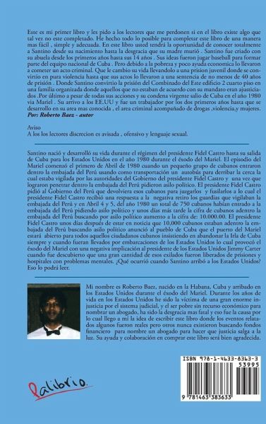 Este es mi primer libro y les pido a los lectores que me perdonen si en el libro existe algo que tal vez no este completado. He hecho todo lo posible para completar este libro de una manera mas fácil , simple y adecuada. En este libro usted tendrá la oportunidad de conocer totalmente a Santino desde su nacimiento hasta la desgracia que su madre murió . Santino fue criado con su abuela desde los primeros años hasta sus 14 años . Sus ideas fueron jugar baseball para formar parte del equipo nacional de Cuba . Pero debido a la pobreza y poco ayuda economica lo llevaron a cometer un acto criminal. Que le cambio su vida llevandolo a una prision juvenil donde se convirtio en pura violencia hasta que sus actos lo llevaron a una sentencia de no menos de 40 años de prisión . Donde Santino convirtio la prisión del Combinado del Este edificio 2 cuarto piso en una familia organizada donde aquellos que no estaban de acuerdo con su mandato eran ajusticiados .Por último a pesar de todas sus acciones y su condena virgente salio de Cuba en el año 1980 via Mariel . Su arrivo a los EE.UU y fue un trabajador por los dos primeros años hasta que se desarrollo en su area mas conocida , el area criminal acompañado de drogas ,violencia,y mujeres. Por: Roberto Baez - autor Aviso A los los lectores discrecion es avisada , ofensivo y lenguaje sexual. Santino nació y desarrolló su vida durante el régimen del presidente Fidel Castro hasta su salida de Cuba para los Estados Unidos en el año 1980 durante el éxodo del Mariel. El episodio del Mariel comenzó el primero de Abril de 1980 cuando un pequeño grupo de cubanos entraron dentro la embajada del Perú usando como transportación un autobús para derribar la cerca la cual estaba vigilada por las autoridades del Gobierno del presidente Fidel Castro y una vez que lograron penetrar dentro la embajada del Perú pidieron asilo político. El presidente Fidel Castro pidió al Gobierno del Perú que devolviera esos cubanos para juzgarlos y fusilarlos a lo cual el presidente Fidel Castro recibió una respuesta a la negativa retiro los guardias que vigilaban la embajada del Perú y en Abril 4 y 5, del año 1980 un total de 750 cubanos habían entrado a la embajada del Perú pidiendo asilo político y unos días más tarde la cifra de cubanos adentro la embajada del Perú buscando por asilo político aumento a la cifra de: 10.000.00. El presidente Fidel Castro unos días después de estar en noticia que 10,000 cubanos estaban adentro la embajada del Perú buscando asilo político anunció al pueblo de Cuba que el puerto del Mariel estará abierto para todos aquellos ciudadanos cubanos insistiendo en abandonar la Irla de Cuba siempre y cuando fueran llevados por embarcaciones de los Estados Unidos lo cual provocó el éxodo del Mariel con una negativa implicación al presidente de los Estados Unidos Jimmy Carter cuando fue descubierto que una gran cantidad de esos exilados fueron liberados de prisiones y hospitales con problemas mentales. ¿Qué ocurrió cuando Santino arribó a los Estados Unidos? Eso lo podrá leer.