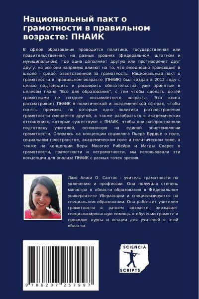 V sfere obrazowaniq prowoditsq politika, gosudarstwennaq ili prawitel'stwennaq, na raznyh urownqh (federal'nom, shtatnom i municipal'nom), gde odna dopolnqet druguü ili protiworechit drug drugu, no wse oni naprqmuü wliqüt na to, chto ezhednewno proishodit w shkole - srede, otwetstwennoj za gramotnost'. Nacional'nyj pakt o gramotnosti w prawil'nom wozraste (PNAIK) byl sozdan w 2012 godu s cel'ü podtwerdit' i rasshirit' obqzatel'stwa, uzhe prinqtye w celewom plane "Vse dlq obrazowaniq", s tem chtoby sdelat' detej gramotnymi ne pozdnee wos'miletnego wozrasta. Jeta kniga rassmatriwaet PNAIK w politicheskoj i akademicheskoj sferah, chtoby ponqt' prichiny, po kotorym odna politika rasprostraneniq gramotnosti smenqetsq drugoj, a takzhe razobrat'sq w akademicheskih otnosheniqh, kotorye suschestwuüt s PNAIK, chtoby oni rasprostranqli podgotowku uchitelej, osnowannuü na edinoj äpistemologii gramotnosti. Opiraqs' na koncepcii sociologa P'era Burd'e o pole, social'nom prostranstwe, akademicheskom pole i politicheskom pole, a takzhe na koncepcii Very Masagao Ribejro i Magdy Soares o gramotnosti, gramotnosti i negramotnosti, my ispol'zowali äti koncepcii dlq analiza PNAIK s raznyh tochek zreniq.