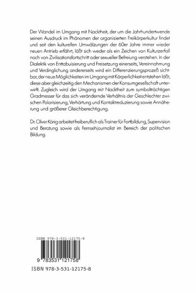 Der Wandel im Umgang mit Nacktheit, der um die Jahrhundertwende seinen Ausdruck im Phänomen der organisierten Freikörperkultur findet und seit den kulturellen Umwälzungen der 60er Jahre immer wieder neuen Antrieb erfährt, läßt sich weder als ein Zeichen von Kulturzerfall noch von Zivilisationsfortschritt oder sexueller Befreiung verstehen. In der Dialektik von Enttabuisierung und Freisetzung einerseits, Vereinnahmung und Verdinglichung andererseits wird ein Differenzierungsprozeß sichtbar, der sowohl neue Möglichkeiten im Umgang mit Körperlichkeit entstehen läßt, diese aber gleichzeitig den Mechanismen der Konsumgesellschaft unterwirft. Zugleich wird der Umgang mit Nacktheit zum symbolträchtigen Gradmesserfür das sich verändernde Verhältnis der Geschlechter zwischen Polarisierung, Verhärtung und Kontaktreduzierung sowie Annäherung und größerer Gleichberechtigung.