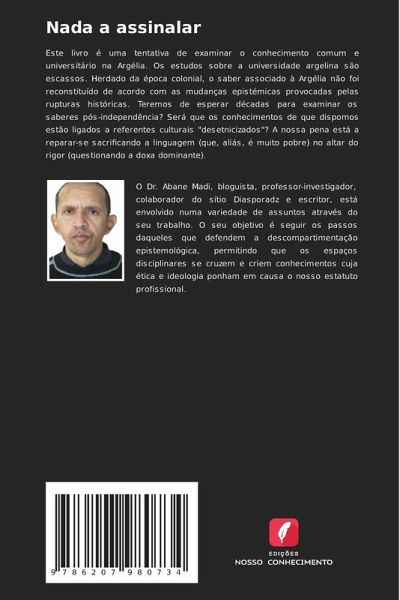Este livro é uma tentativa de examinar o conhecimento comum e universitário na Argélia. Os estudos sobre a universidade argelina são escassos. Herdado da época colonial, o saber associado à Argélia não foi reconstituído de acordo com as mudanças epistémicas provocadas pelas rupturas históricas. Teremos de esperar décadas para examinar os saberes pós-independência? Será que os conhecimentos de que dispomos estão ligados a referentes culturais "desetnicizados"? A nossa pena está a reparar-se sacrificando a linguagem (que, aliás, é muito pobre) no altar do rigor (questionando a doxa dominante).
