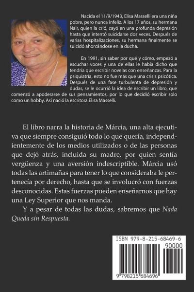 El libro narra la historia de Márcia, una alta ejecutiva que siempre consiguió todo lo que quería, independientemente de los medios utilizados o de las personas que dejó atrás, incluida su madre, por quien sentía vergüenza y una aversión indescriptible. Márcia usó todas las artimañas para tener lo que consideraba le pertenecía por derecho, hasta que se involucró con fuerzas desconocidas. Estas fuerzas pueden enseñarnos que hay una Ley Superior que nos manda. Y a pesar de todas las dudas, sabremos que Nada Queda sin Respuesta.