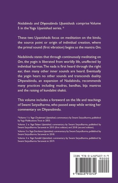 Nadabindu and Dhyanabindu Upanishads comprise Volume 5 in the Yoga Upanishad series. These Upanishads focus on meditation on the bindu, the source point or origin of individual creation, where begins the primal sound or first vibration, the mantra Om. They define and describe in detail the mantra Om, the effects of meditating on it until one attains perfect liberation, merging with the Divine. Nadabindu states that always meditating on Om, the yogin is liberated from worldly life, unaffected by his/her karmas. The nada is first heard through the right ear, and many other inner sounds are heard. Eventually the yogin hears no other sounds and transcends duality. Dhyanabindu, an expansion of Nadabindu, recommends many practices including mudras, bandhas, bija mantras and raising kundalini shakti. This volume includes a foreword on the life and teachings of Swami Satyadharma, who passed away while writing her commentary on Dhyanabindu.