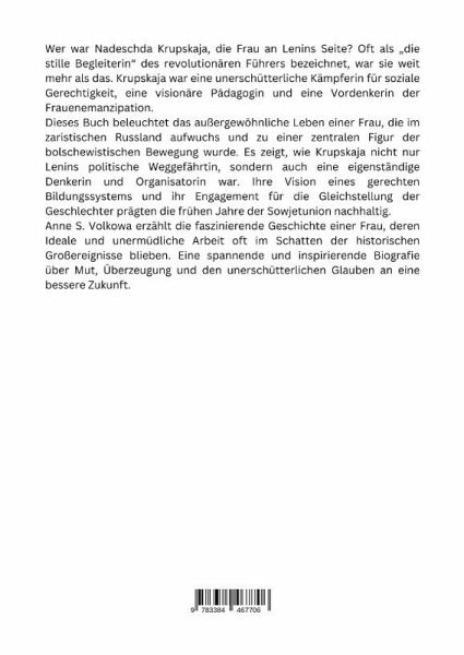Wer war Nadeschda Krupskaja, die Frau an Lenins Seite? Oft als "die stille Begleiterin" des revolutionären Führers bezeichnet, war sie weit mehr als das. Krupskaja war eine unerschütterliche Kämpferin für soziale Gerechtigkeit, eine visionäre Pädagogin und eine Vordenkerin der Frauenemanzipation.Dieses Buch beleuchtet das außergewöhnliche Leben einer Frau, die im zaristischen Russland aufwuchs und zu einer zentralen Figur der bolschewistischen Bewegung wurde. Es zeigt, wie Krupskaja nicht nur Lenins politische Weggefährtin, sondern auch eine eigenständige Denkerin und Organisatorin war. Ihre Vision eines gerechten Bildungssystems und ihr Engagement für die Gleichstellung der Geschlechter prägten die frühen Jahre der Sowjetunion nachhaltig.Anne S. Volkowa erzählt die faszinierende Geschichte einer Frau, deren Ideale und unermüdliche Arbeit oft im Schatten der historischen Großereignisse blieben. Eine spannende und inspirierende Biografie über Mut, Überzeugung und den unerschütterlichen Glauben an eine bessere Zukunft.