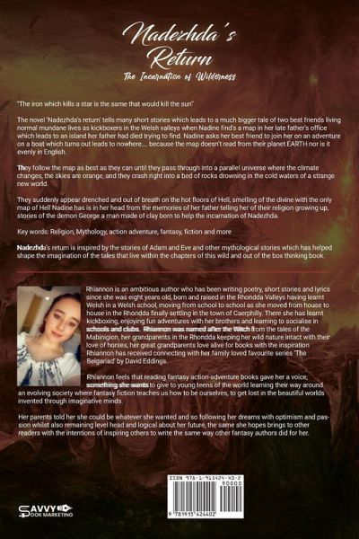 "The iron which kills a star is the same that would kill the sun" The novel 'Nadezhda's return' tells many short stories which leads to a much bigger tale of two best friends living normal mundane lives as kickboxers in the Welsh valleys when Nadine find's a map in her late father's office which leads to an island her father had died trying to find. Nadine asks her best friend to join her on an adventure on a boat which turns out leads to nowhere.... because the map doesn't read from their planet EARTH nor is it evenly in English. They follow the map as best as they can until they pass through into a parallel universe where the climate changes, the skies are orange, and they crash right into a bed of rocks drowning in the cold waters of a strange new world. They suddenly appear drenched and out of breath on the hot floors of Hell, smelling of the divine with the only map of Hell Nadine has is in her head from the memories of her father telling her of their religion growing up, stories of the demon George a man made of clay born to help the incarnation of Nadezhda. Nadezhda's return is inspired by the stories of Adam and Eve and other mythological stories which has helped shape the imagination of the tales that live within the chapters of this wild and out of the box thinking book. Thank you
