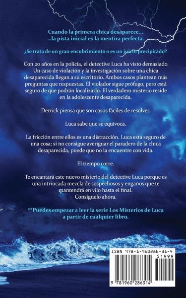 Cuando la primera chica desaparece... ...la pista inicial es la mentira perfecta. ¿Se trata de un gran encubrimiento o es un juicio precipitado? Con 20 años en la policía, el detective Luca ha visto demasiado. Un caso de violación y la investigación sobre una chica desaparecida llegan a su escritorio. Ambos casos plantean más preguntas que respuestas. El violador sigue prófugo, pero está seguro de que podrán localizarlo. El verdadero misterio reside en la adolescente desaparecida. Derrick piensa que son casos fáciles de resolver. Luca sabe que se equivoca. La fricción entre ellos es una distracción. Luca está seguro de una cosa: si no consigue averiguar el paradero de la chica desaparecida, puede que no la encuentre con vida. El tiempo corre. Te encantará este nuevo misterio del detective Luca porque es una intrincada mezcla de sospechosos y engaños que te mantendrá en vilo hasta el final. Consíguelo ahora. **Puedes empezar a leer la serie Los Misterios de Luca a partir de cualquier libro.