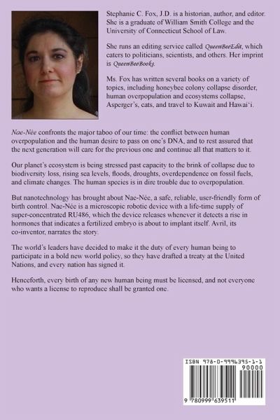 Nae-Née posits a world not unlike our own, as it confronts the major taboo of our time: the conflict between human overpopulation and the human desire to pass on one's DNA and one's culture. Our planet's ecosystem is being stressed past capacity to the brink of collapse due to biodiversity loss, rising sea levels, floods, droughts, overdependence on fossil fuels, and the climate changes that drive all that. In short, the human species is in dire trouble due to overpopulation - its own. No one seems remotely inclined to sacrifice any comfort or control over their habits in order to save the environment and ultimately their own future existence, happiness, or sense of purpose. But there is a significant difference: nanite technology has advanced sufficiently to be of actual, practical use to physicians and scientists. Nae-Née is a safe, reliable, user-friendly form of birth control. It is a microscopic nanite - a little robot. It contains a life-time supply of super-concentrated RU486, which the device releases whenever it detects a rise in hormones that indicates a fertilized embryo is about to implant itself. All that the inventors - a husband-and-wife team - wanted was a convenient form of birth control that would reliably prevent pregnancy without pumping a woman's body full of artificial hormones. Its name literally translates as "not born" and was chosen by Avril, the wife, to reflect her husband's Scottish background and her own French ancestry. The story is told from Avril's point of view, a woman with Asperger's and a professor of women's medical history. The world's leaders have decided to make it the duty of every human being to participate in a bold new world policy, so they have drafted a treaty at the United Nations, and every nation has agreed to sign onto it. This is done on a date that doom-sayers have anticipated with predictions of various - and often unrelated - dire consequences: December 21, 2012. Under the terms of the treaty, all women must have a government-registered Nae-Née device. Henceforth, every birth of any new human being must be licensed, and not everyone who wants a license to reproduce shall be granted one.